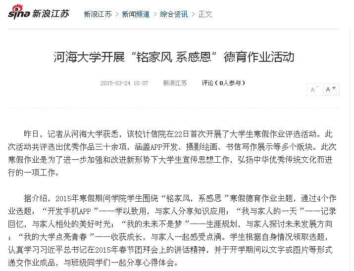 324,新浪江苏报道了我院开展的铭家风,系感恩德育作业活动,在报道中,宣传了我院弘扬传统文化与改进大学生思想政治教育工作的新举措,肯定了该项工作取得的成果。