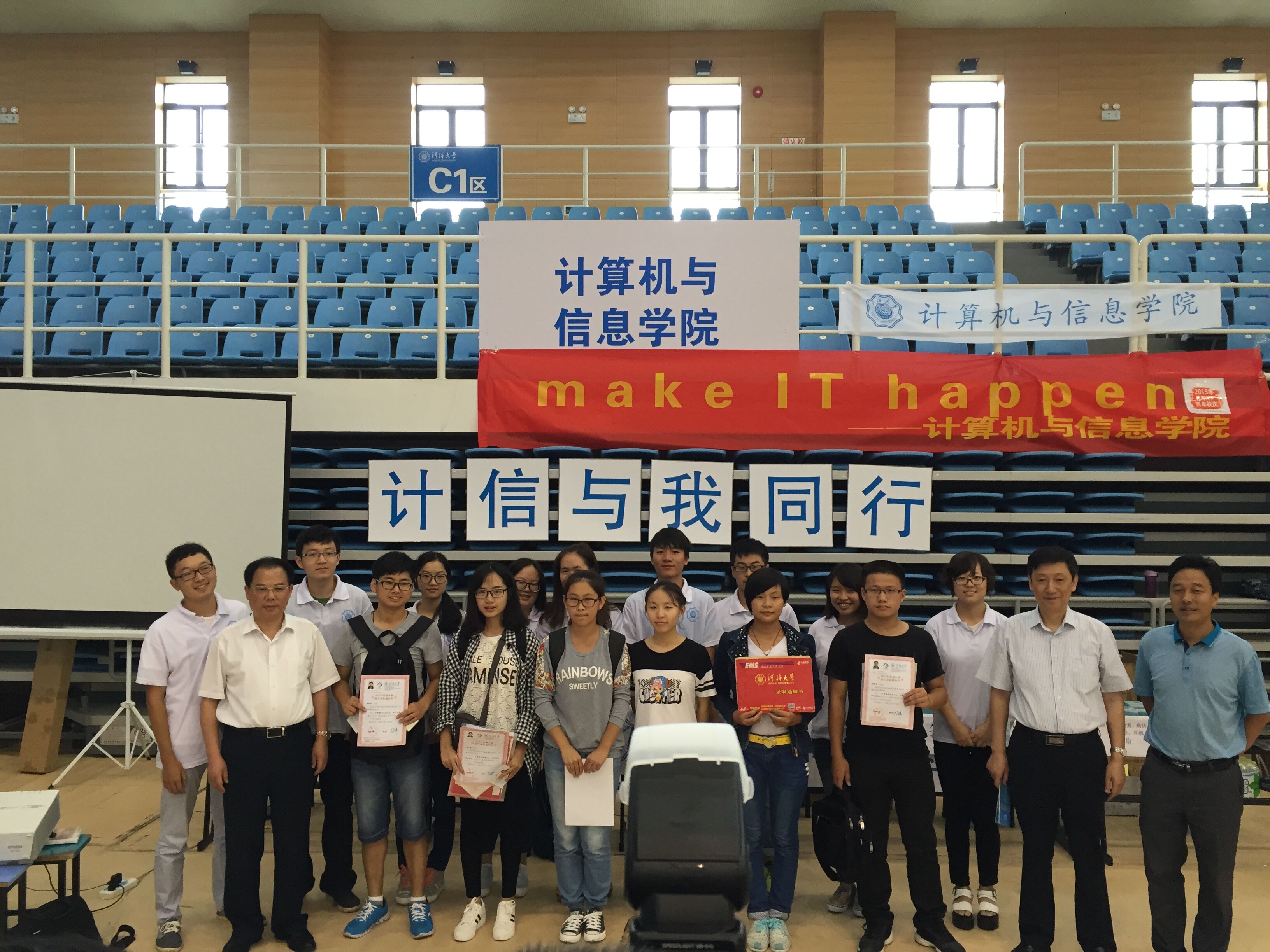 9月15日上午,校党委书记朱拓、校长徐辉及学校相关部处领导来到文体中心我院迎新报到点检查指导我院迎新工作。学院党委书记张雪刚、副书记张炜及新生辅导员陪同,汇报了迎新工作的相关安排,校领导与我院的15级新生和志愿者合影留念。