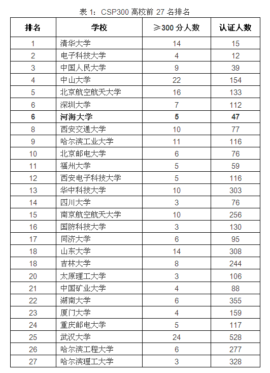 此次认证考试共有来自全国200多高校的6931人参加,满分500分。认证成绩400分以上的有44人,我校1人。认证成绩在300分以上且参加认证人数在10人以上的有39所院校,共238人。麻豆tv 排名第6,各校300分以上人数排名(CSP300)(见表1)。