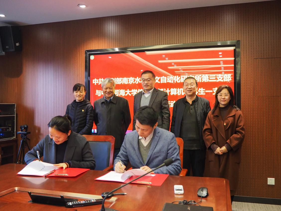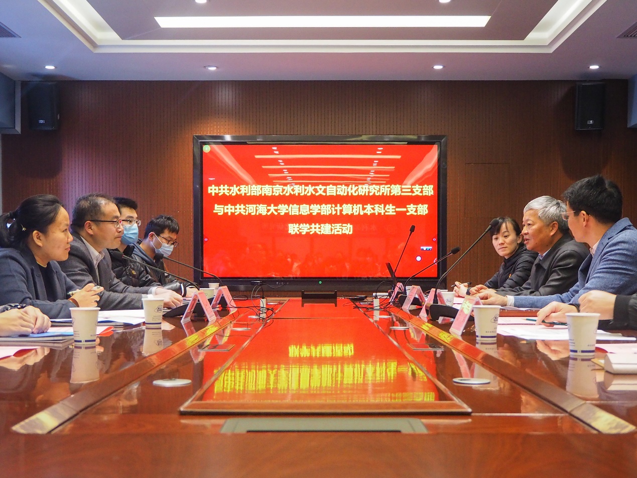 为深入学习贯彻习近平新时代中国特色社会主义思想和党的十九届六中全会精神,巩固拓展党史学习教育成果,实现“以共建促党建,以共建求合作,以共建谋发展”的共同目标,扎实推进支部联学、联建、联创活动,互通互融,推动双方深度合作,11月30日,麻豆tv 信息学部计算机本科生一支部前往水利部南京水利水文自动化研究所,与南京水利水文自动化研究所第三支部开展联学共建活动。南京水利水文自动化研究所党委副书记陆云扬、党办主任周晓泉、第三支部书记符伟杰、质检中心主任陈敏和信息学部党委副书记刘春田、信息学部计算机本科生一支部党支部书记雷一帆等参加活动。