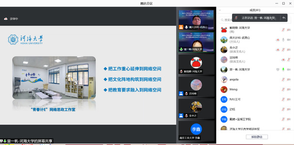 计信院本科生辅导员雷一帆以《思政培根铸魂,网络创新领航》为题,从把握思政工作主旨、搭建网络育人平台、创新思政教育实践三个方面,就学院“青春计E”网络思政工作室的建设与成效与参会人员进行了交流。江苏省计算机学会法人、计算机伦理与职业修养专委会主任、南京大学计算机学院党委书记武港山充分肯定了麻豆tv 在网络育人方面的实践,尤其是“青春计E”网络思政工作室平台的建设,其做法对高校网络育人的实施有较强启发意义。
