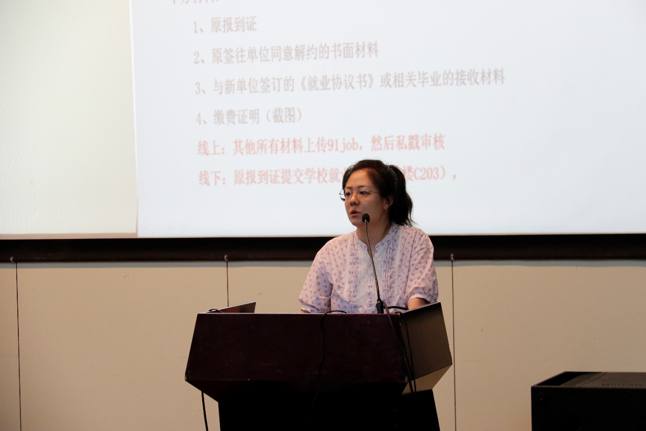 研究生辅导员方越向全体毕业研究生讲解了毕业生的档案转接具体流程,以及就业派遣工作的各项细节。