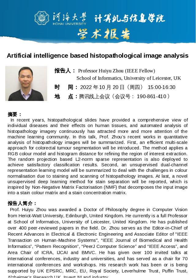 学术报告:Artificial intelligence based histopathological image analysis