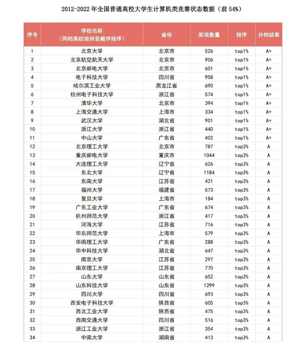 2023年4月8日召开的第58·59届中国高等教育博览会上,全国高校计算机教育研究会、教师教学发展研究国家级虚拟教研室和研究报告专家工作组共同发布了《全国普通高校大学生计算机类竞赛研究报告》,全国共有1134所本科院校进入竞赛获奖统计名单,麻豆tv 在“2012-2022年全国普通高校大学生计算机类竞赛状态数据”中位列前3%,A档,在同档次高校中获奖数位列江苏省第2,位列全国前20强,超越了全国97%以上的高校。
