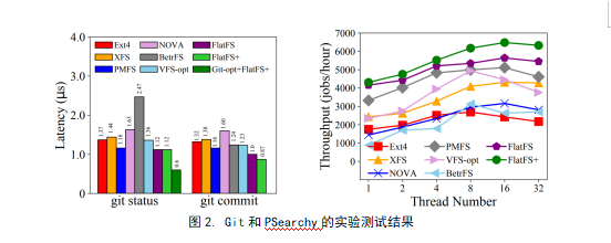 论文实验对比了两种商用文件系统和五种研究型文件系统,采用标准的基准测试程序集(如FilebenchFxMark)和真实的应用程序(如版本控制工具Git,大数据仓库Hive,文件索引软件PSearchy)。FlatFS+在文件路径解析的效率、扩展性,目录文件遍历等方面均有较大的提升,实验结果表明FlatFS+最多能提升4倍的文件元数据操作性能。