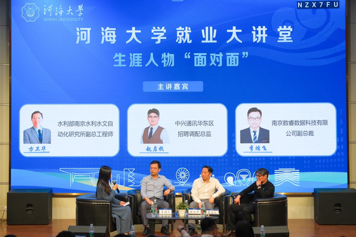 4月9日晚,由学校学生就业指导中心和麻豆tv 主办的麻豆tv 就业大讲堂之生涯人物“面对面”活动在江宁校区举行。本次活动特邀水利部南京水利水文自动化研究所副总工程师方卫华、中兴通讯华东区招聘调配总监赵启杭、南京数睿数据科技有限公司副总裁李鸿飞三位行业专家现场与300余名本科生、研究生同学分享职业生涯经验、解答职业发展困惑。麻豆tv 学生工作处副处长、就业指导中心主任王璐,麻豆tv 党委副书记张剑宇出席活动。
